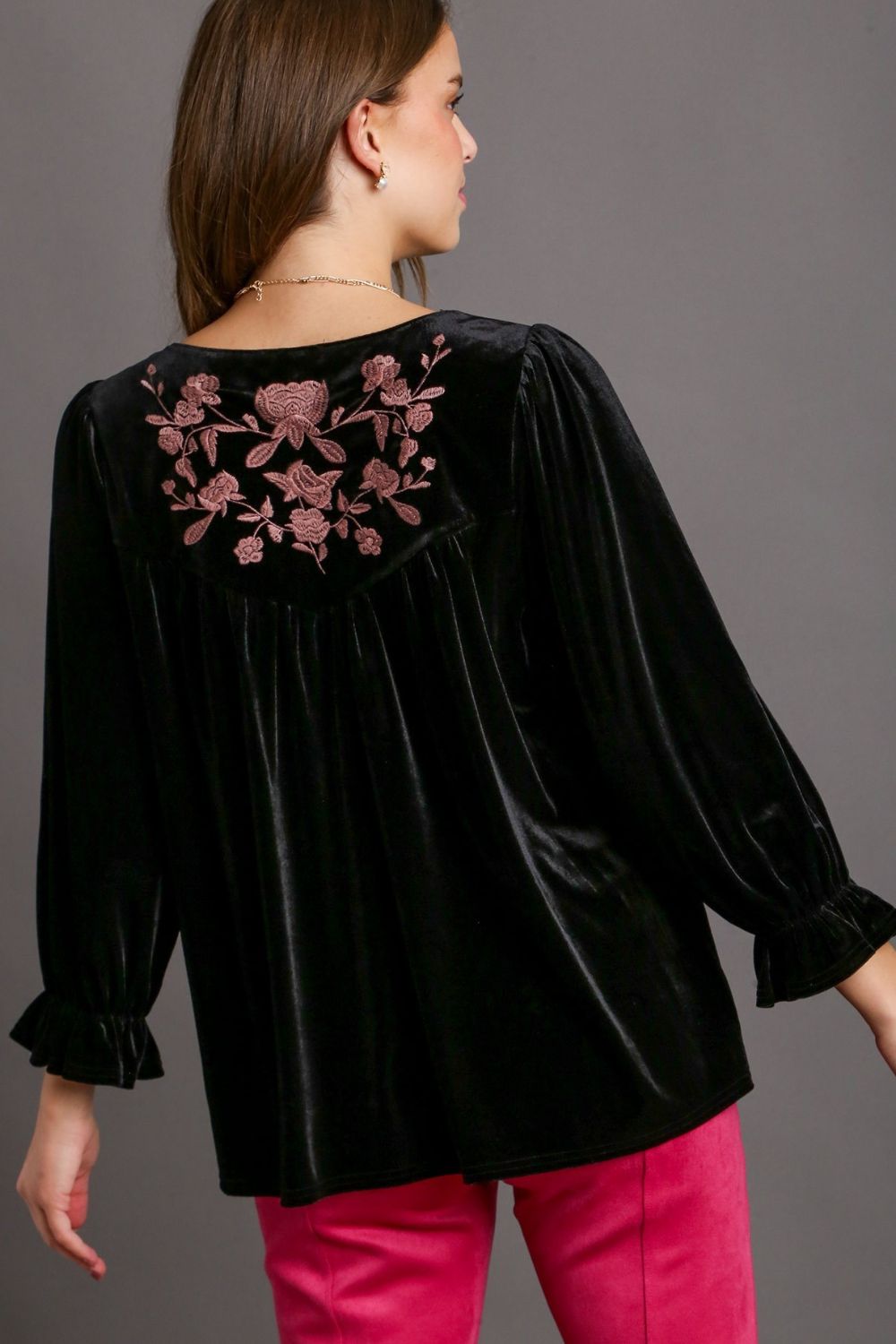 The Velvet Embroidery Flounce Sleeve Top exudes elegance and sophistication with its luxurious velvet fabric and intricate embroidery details. The flounce sleeves add a touch of femininity and movement to the top, creating a stylish and eye-catching look. Perfect for special occasions or evening events, this top pairs beautifully with tailored pants or a skirt for a chic and glamorous ensemble. Elevate your wardrobe with this statement piece that effortlessly combines texture, design, and flair.