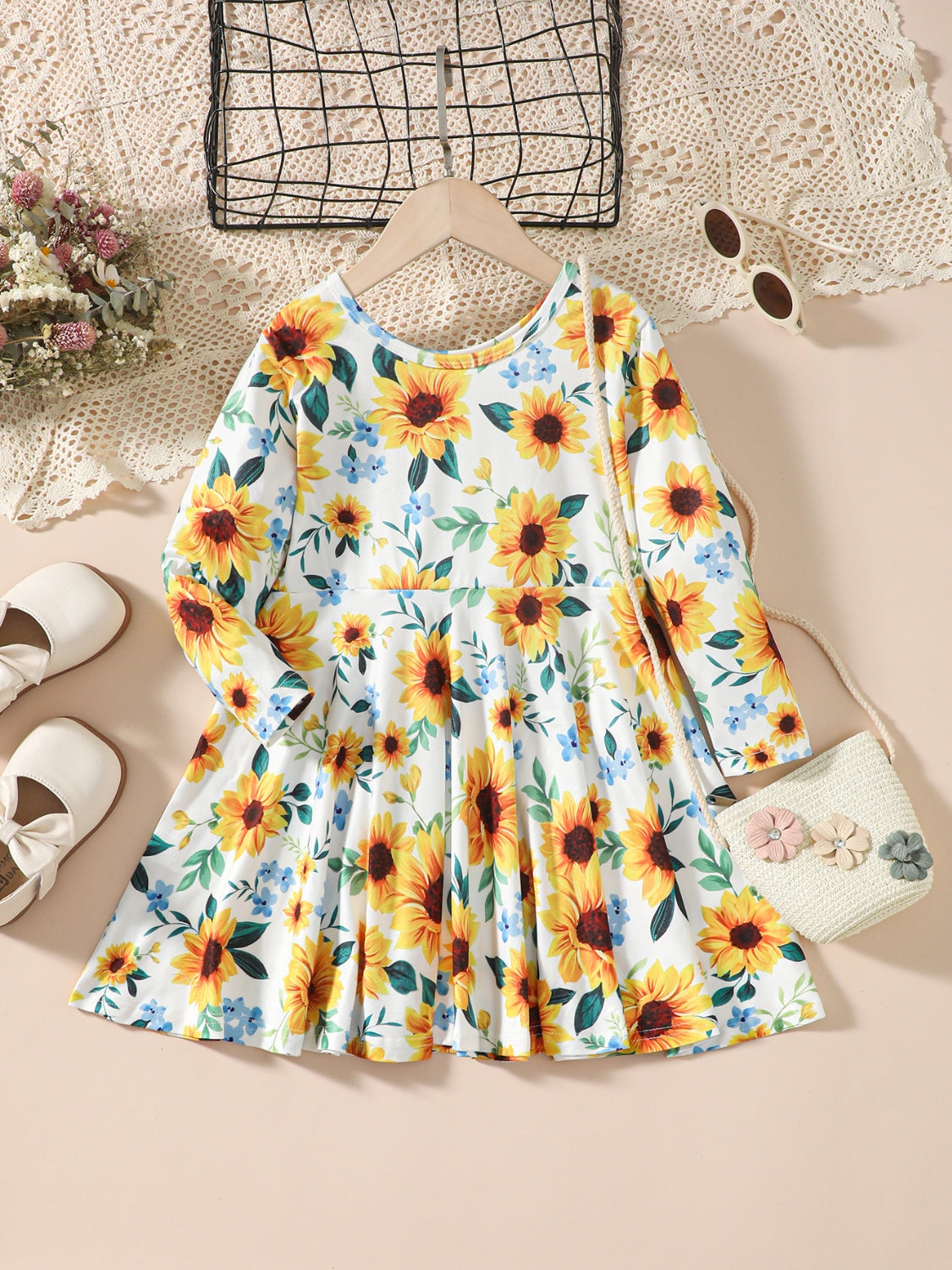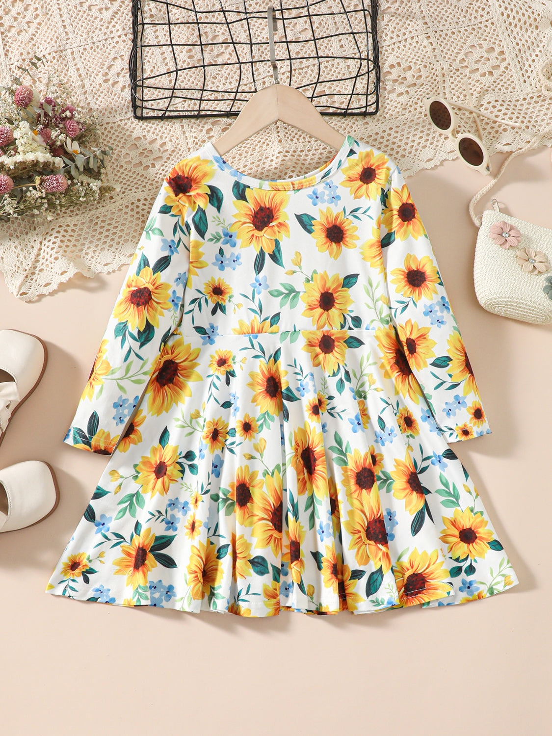 Kids Sunflower Print Round Neck Long Sleeve Dress